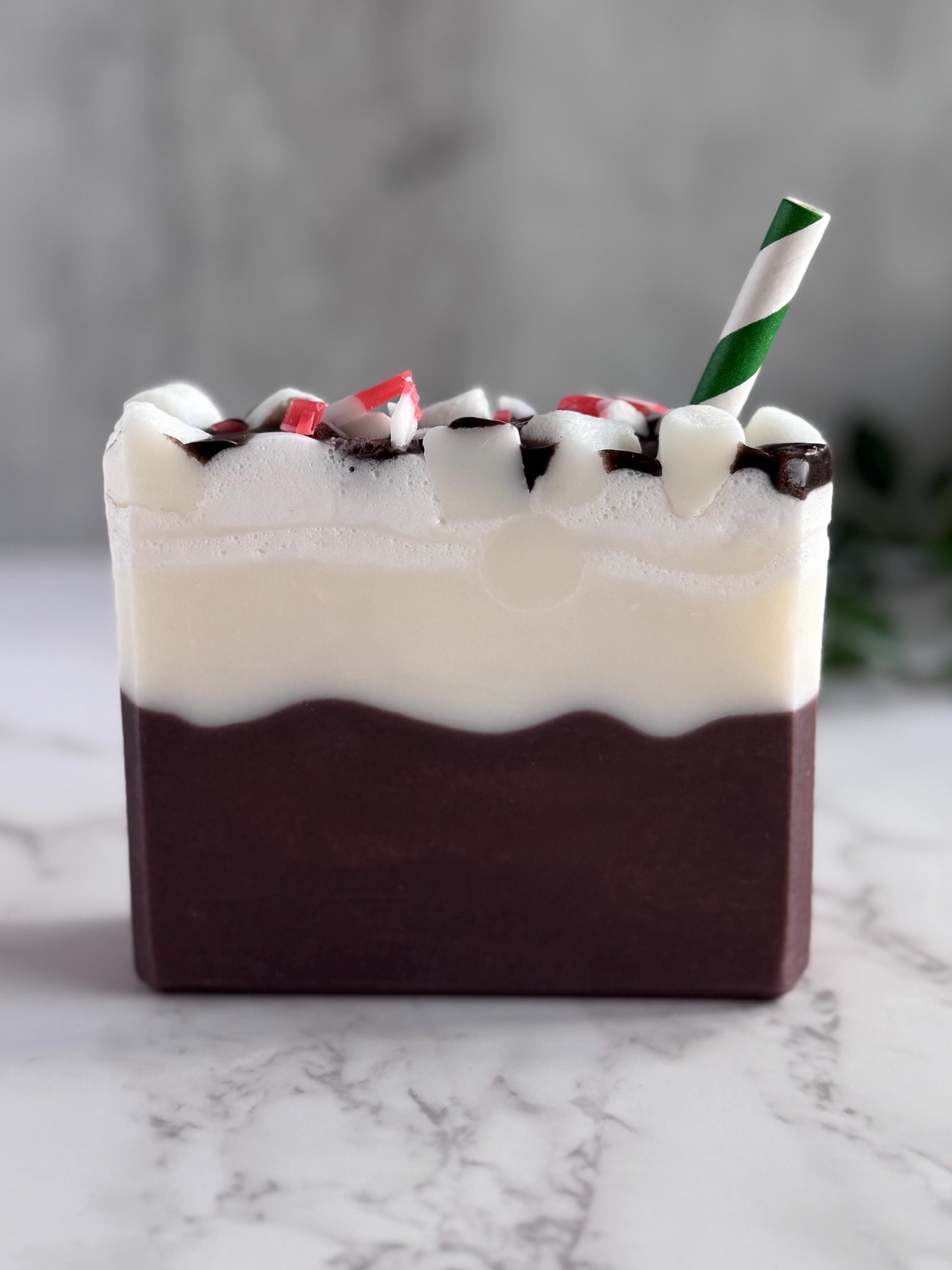 Each bar is decorated with soap mini marshmallows, chocolate drizzle, and a paper straw for the perfect festive touch.
