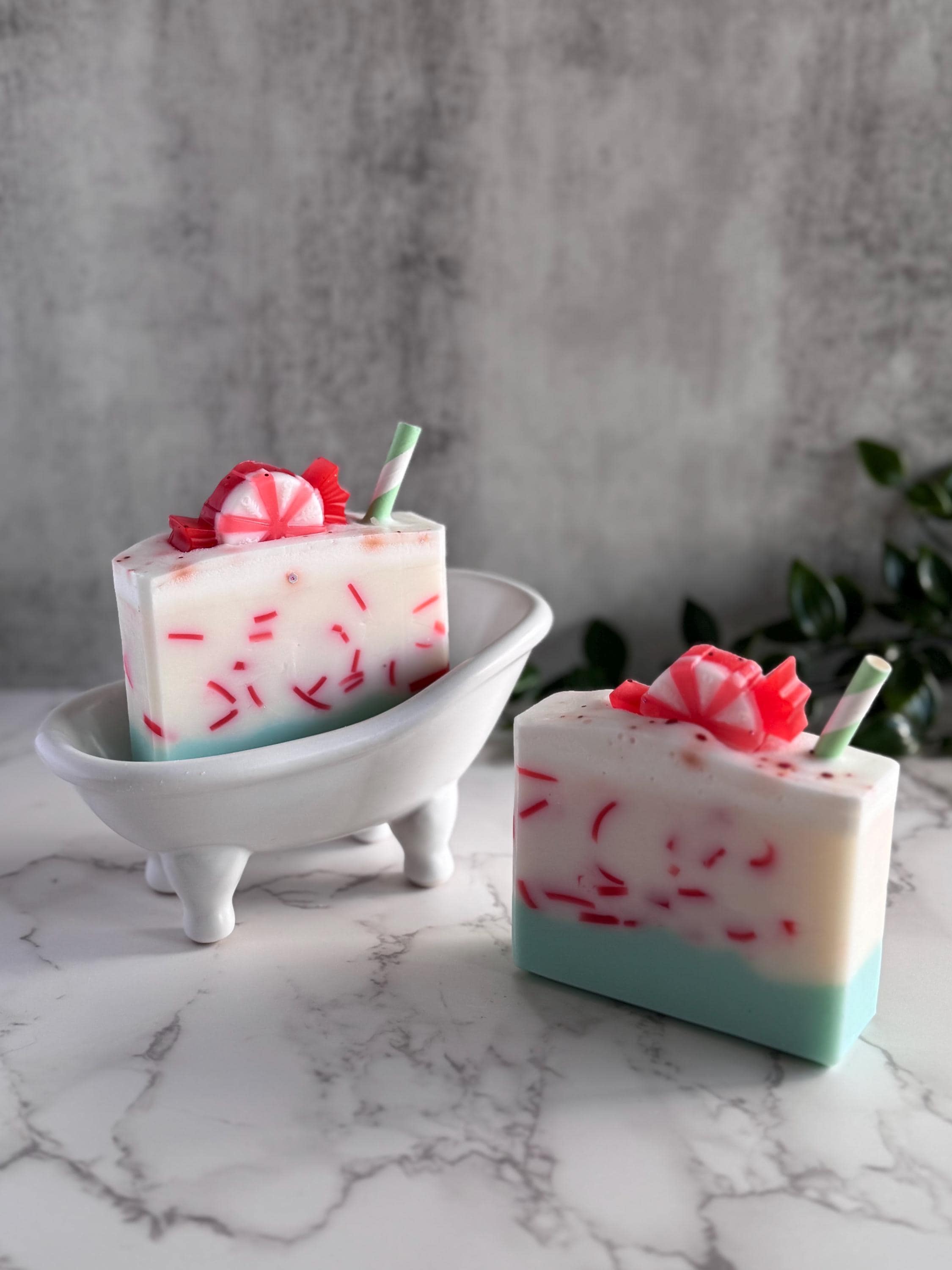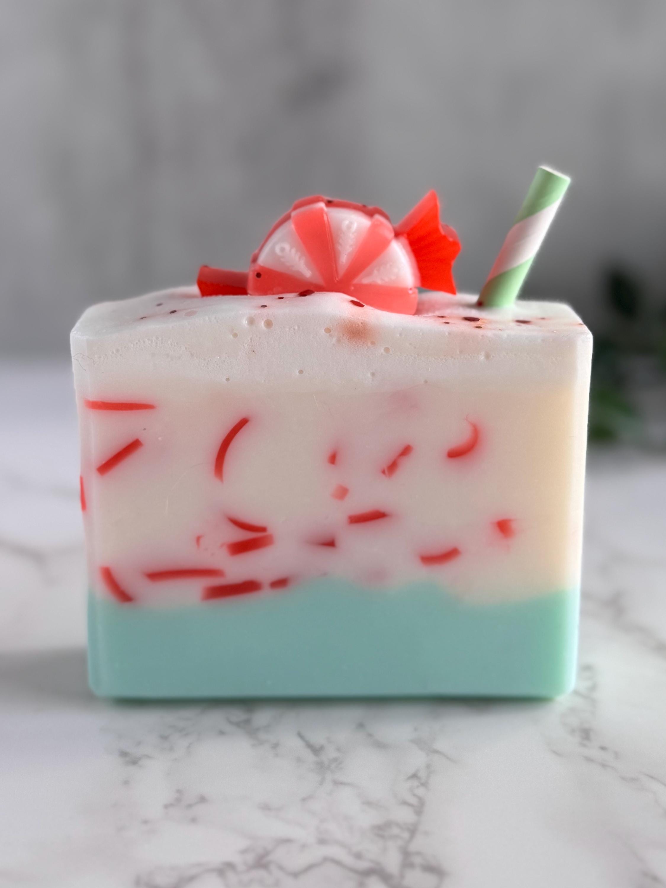 This soap bar feels like a sweet winter treat: cool peppermint candy, creamy vanilla sweetness, soft foamy layers, and the cozy magic of Christmas mornings.